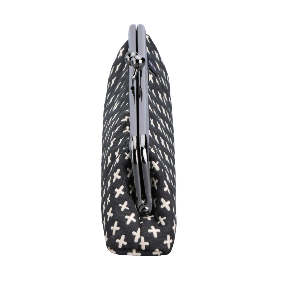 こちらのがま口は、ふっくらとした立体感のあるふくれ織り生地で仕立てました。ポコポコとした緩やかな凹凸は、ほっこりと可愛らしく、なごみます。京都らしい和の文様で、お土産にも最適です。裏地は、グレー色のポリエステルジャガード素材ですので、汚れが目立ちにくいです。
