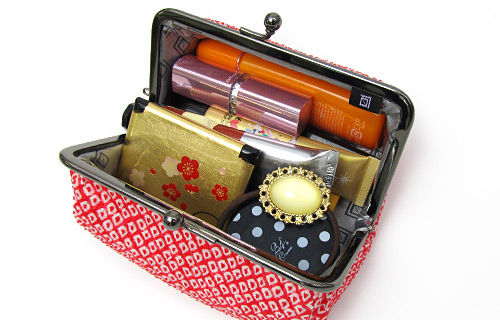 大きさは、俵型で少し大きめな4.5寸サイズ。メイク道具一式がたっぷりと入ります。表面は、汚れがつきにくいテフロン加工を施し、使い勝手も良いです。