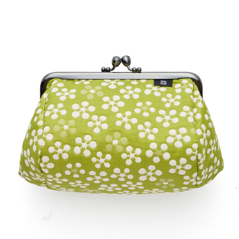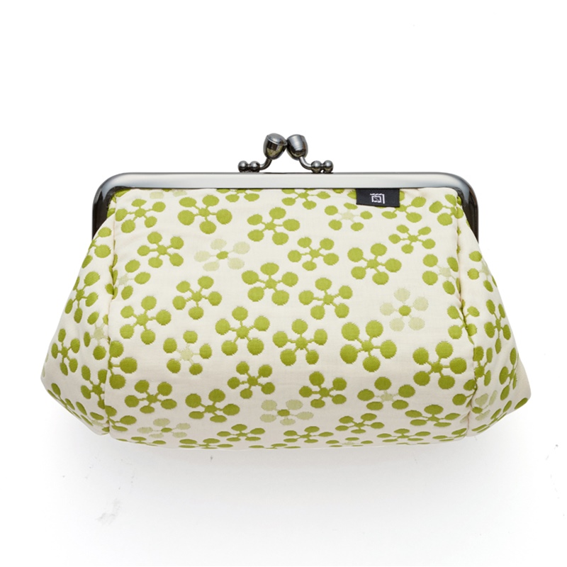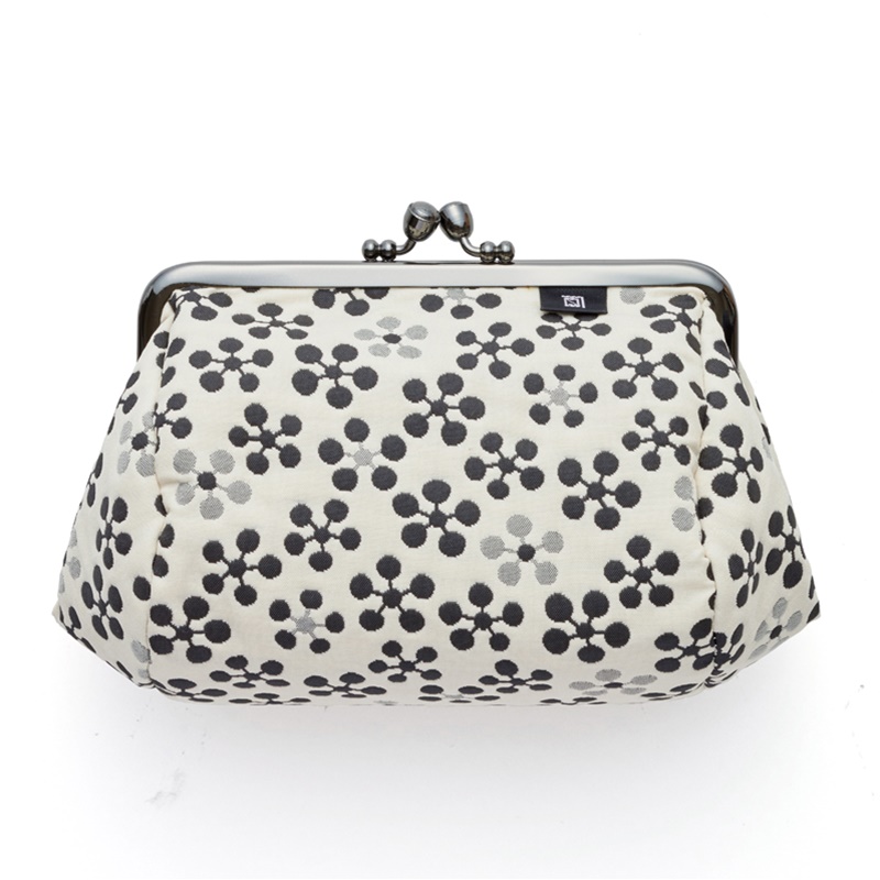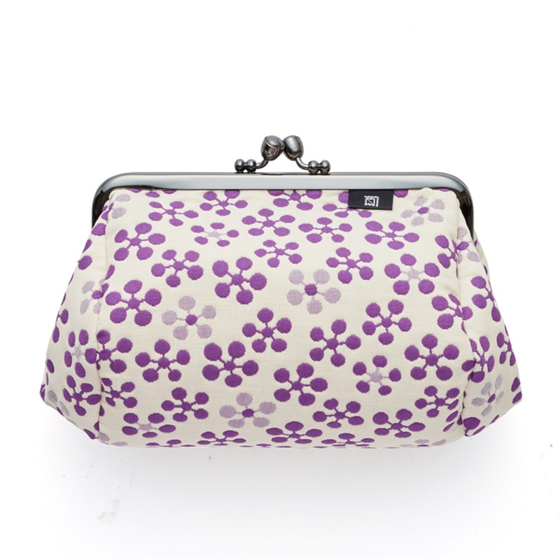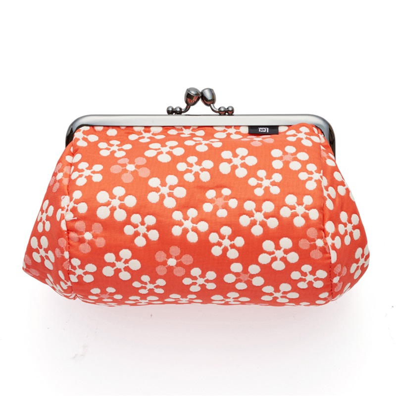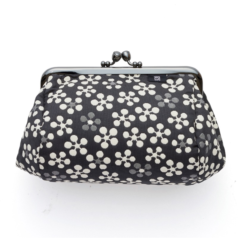 こちらのがま口は、ふっくらとした立体感のあるふくれ織り生地で仕立てました。ポコポコとした緩やかな凹凸は、ほっこりと可愛らしく、なごみます。京都らしい和の文様で、お土産にも最適です。 裏地は、グレー色のポリエステルジャガード素材ですので、汚れが目立ちにくいです。
