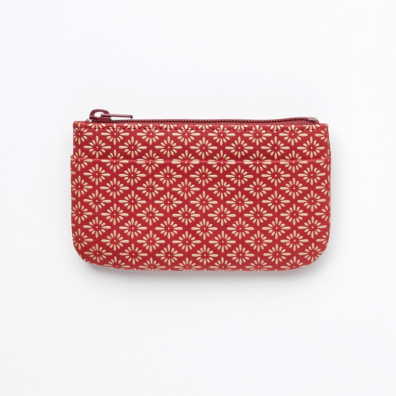 しなりが良く手に馴染みやすいコインケース。落ち着いたトーンの赤の鹿革地に、ベージュ色の漆柄が綺麗に映えます。コーディネートのカラーアクセントになる可愛い色柄です。