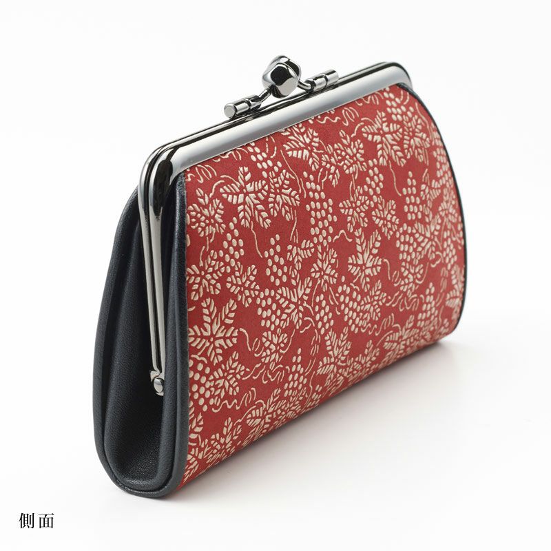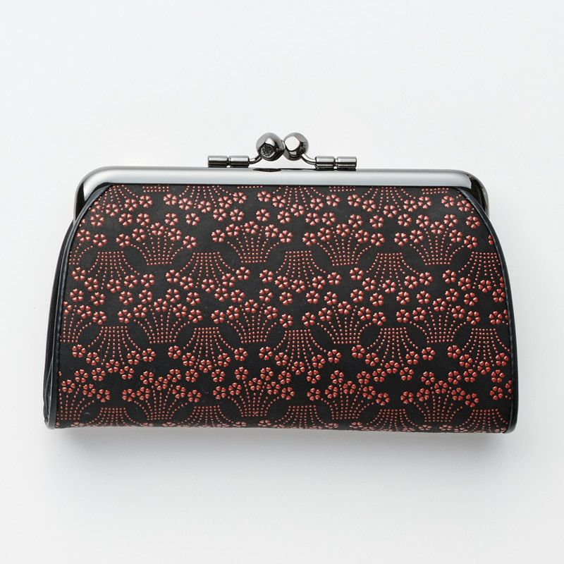 シックで落ち着き感があり、丸みのある形が女性らしいがま口です。黒の鹿革地に濃い赤漆が、柄を引き立たせ印象的です。上品で大人っぽい雰囲気ながら、小桜柄の素朴な愛らしさもあります。