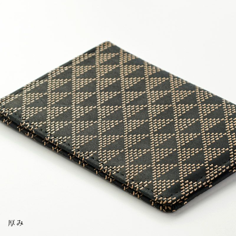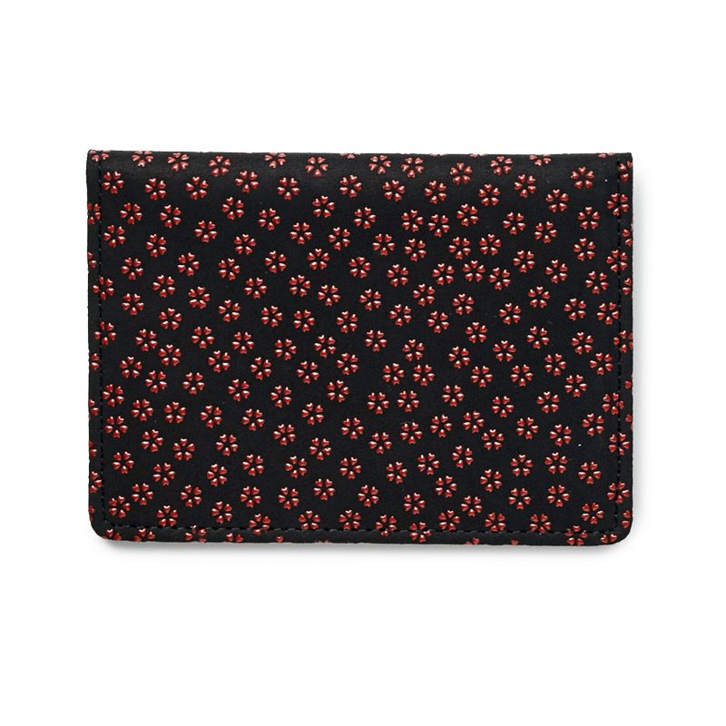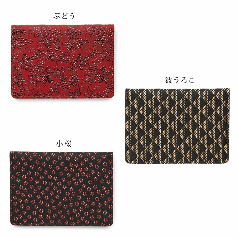 定期券やカード数枚を収納できるパスケースです。黒の鹿革地に濃い赤漆が、柄を引き立たせ印象的です。上品で大人っぽい雰囲気ながら、小桜柄の素朴な愛らしさもあります。