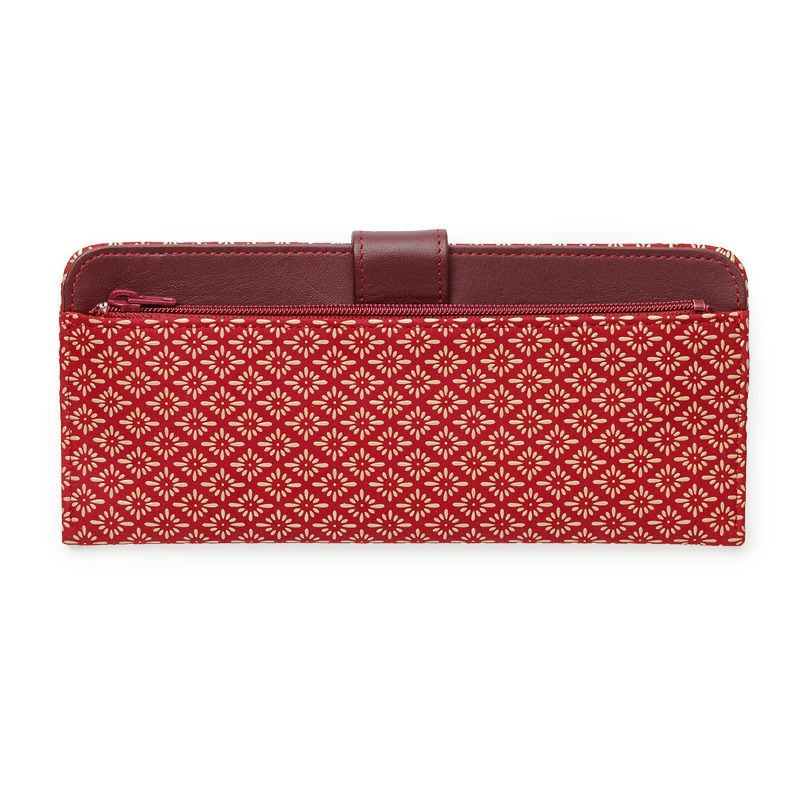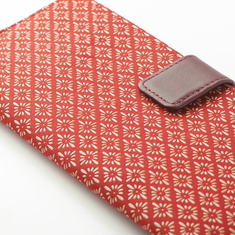 札入れ・小銭入れ・カードホルダーが付いています。落ち着いたトーンの赤の鹿革地に、ベージュ色の漆柄が綺麗に映えます。コーディネートのカラーアクセントになる可愛い色柄です。