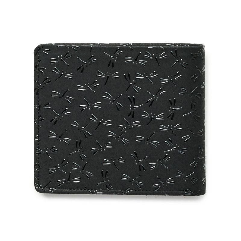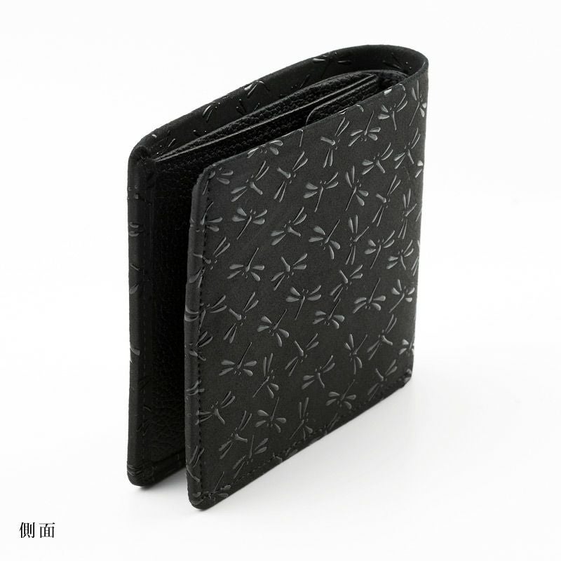 必要な機能が備わった、スリムでシンプルな折り財布 【印傳屋 2003】甲州印伝 本革 薄型 スナップ留め小銭入れ付き 二つ折り財布《 黒地×黒漆 / とんぼ柄 》