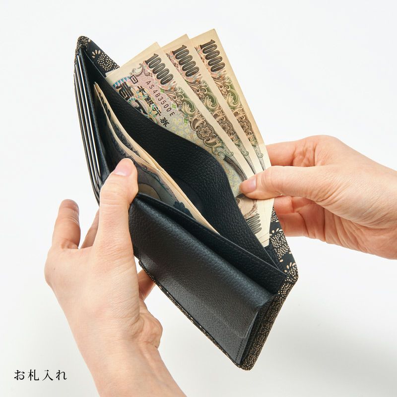 ●詳細: 札入れ(間仕切り)、小銭入れ(間仕切り)、カードホルダー4つ、ポケット3つ