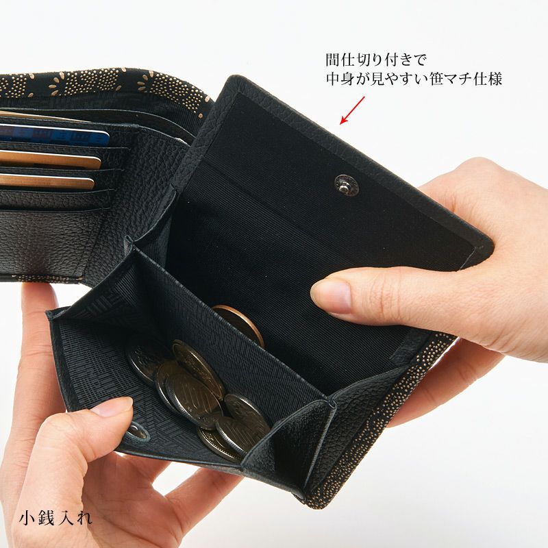 札入れには間仕切りがあり、紙幣やレシートを分けて整理することができます。 ![]() 厚みを抑えつつ、収納力があるコインケース。 小銭入れは、厚みを抑えながら見た目より収納力のある笹マチ仕様。上フタはスナップ留めでポチッと開きやすいです。間仕切り付きで小銭を分けて整理できます。 |