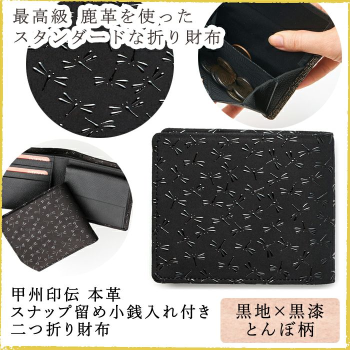 黒の鹿革地に、艶感のある黒漆が洗練されたデザインを印象づけます。