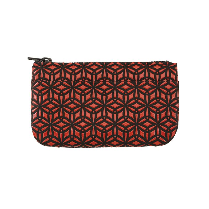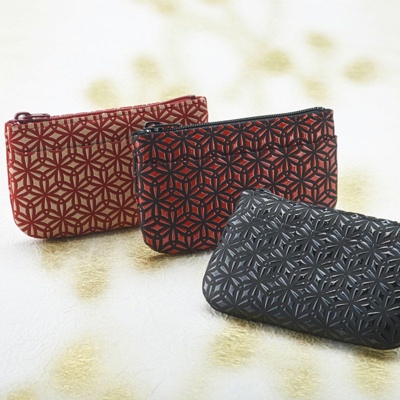 しなりが良く手に馴染みやすいコインケース。黒の鹿革地に、赤漆のツヤが映えて素敵です。ユニセックスな印象で男女ともに使って頂けます。さんび堂の別注でお作りした「麻の葉」の印伝。漆付け部分が多く、ツヤ感があり、モダンで力強いデザインとなっております。