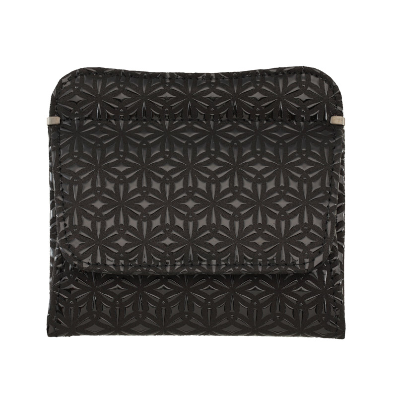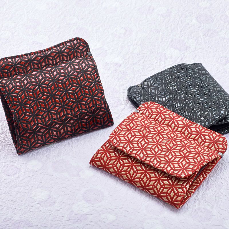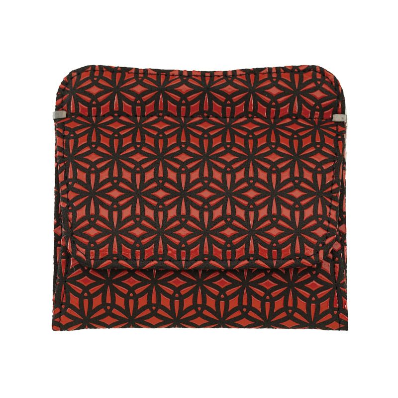 小銭入れが主役ですが、折り畳んだお札やカードも収納できます。黒の鹿革地に、赤漆のツヤが映えて素敵です。ユニセックスな印象で男女ともに使って頂けます。さんび堂の別注でお作りした「麻の葉」の印伝。漆付け部分が多く、ツヤ感があり、モダンで力強いデザインとなっております。