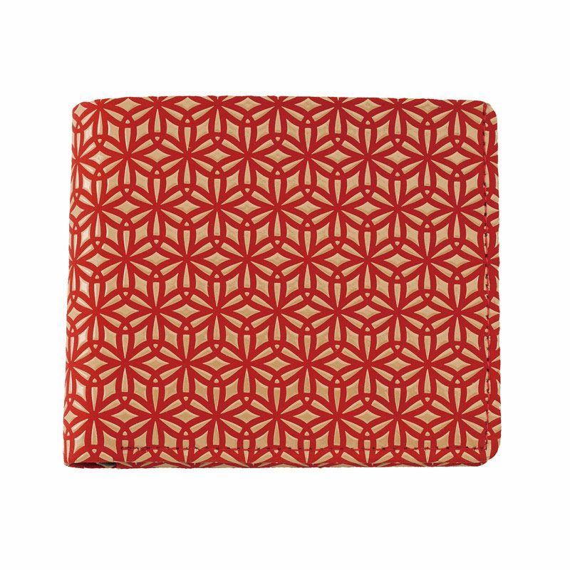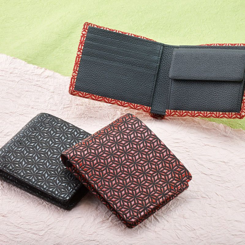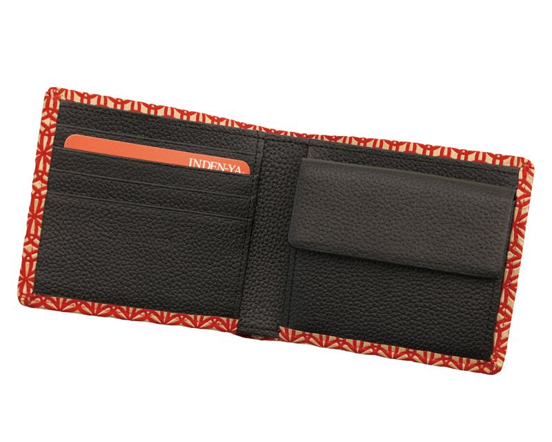 落ち着いたトーンの赤の鹿革地に、ベージュ色の漆柄が綺麗に映えます。さんび堂の別注でお作りした「麻の葉」の印伝。漆付け部分が多く、ツヤ感があり、モダンで力強いデザインとなっております。