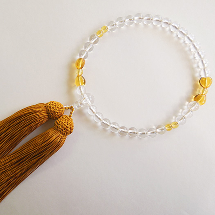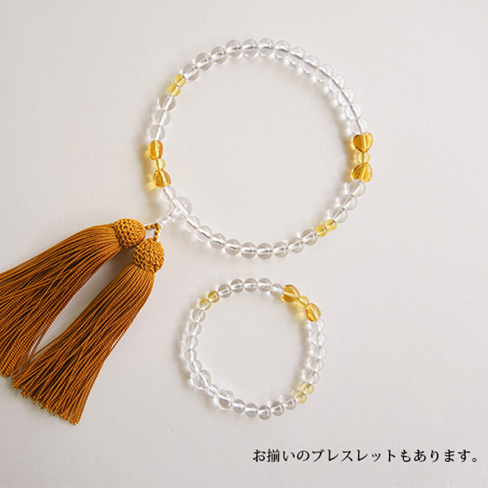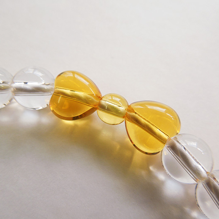 ハート型の黄水晶でリボンをかたどった安田念珠店オリジナルの女性用片手念珠です。