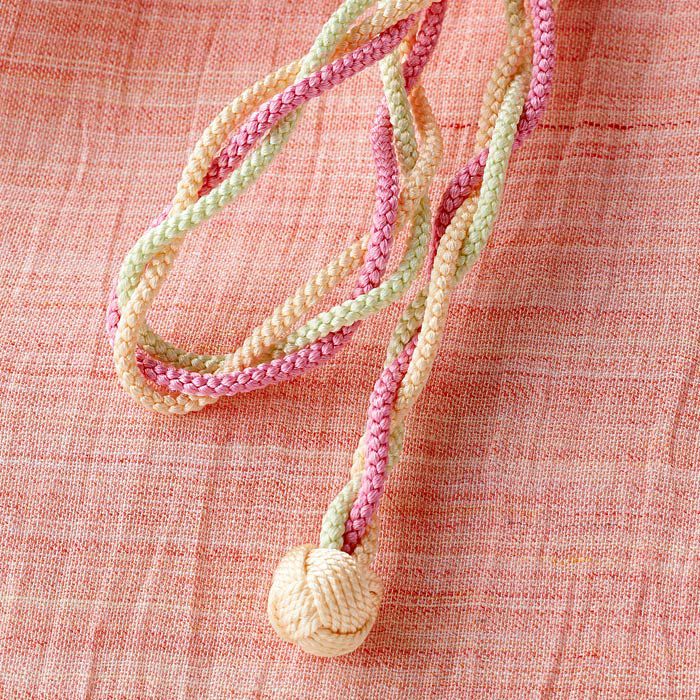 中央の結び紐は、カラフルな細い組紐3本をねじって先端に丸い小田巻を飾りました。シンプルな無地バッグの可愛いカラーアクセントになっています。