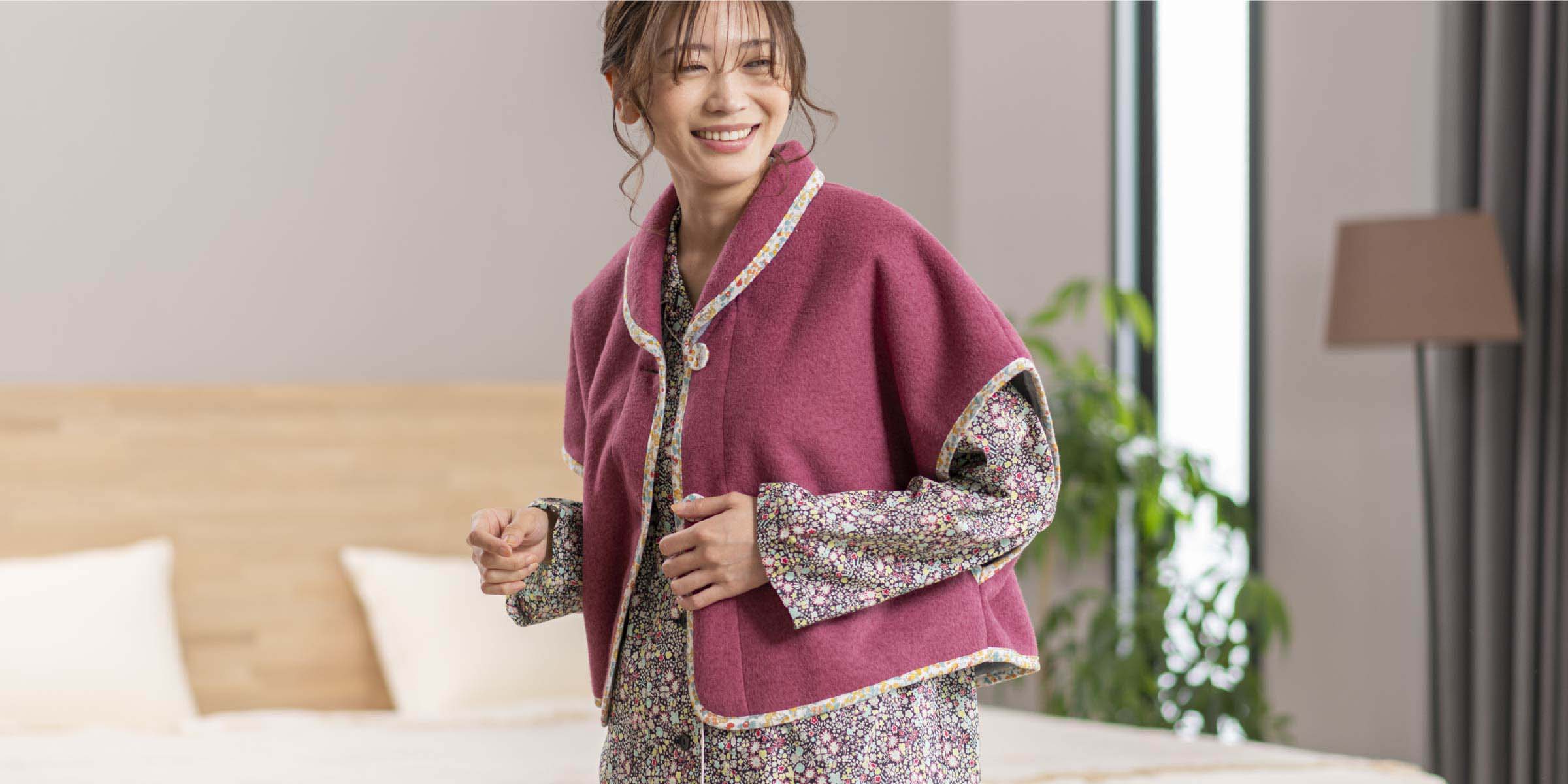 とても寒い日にパジャマの上に羽織って頂けるフリースジャケットと、肩から羽織って頂けるフリースブランケット。