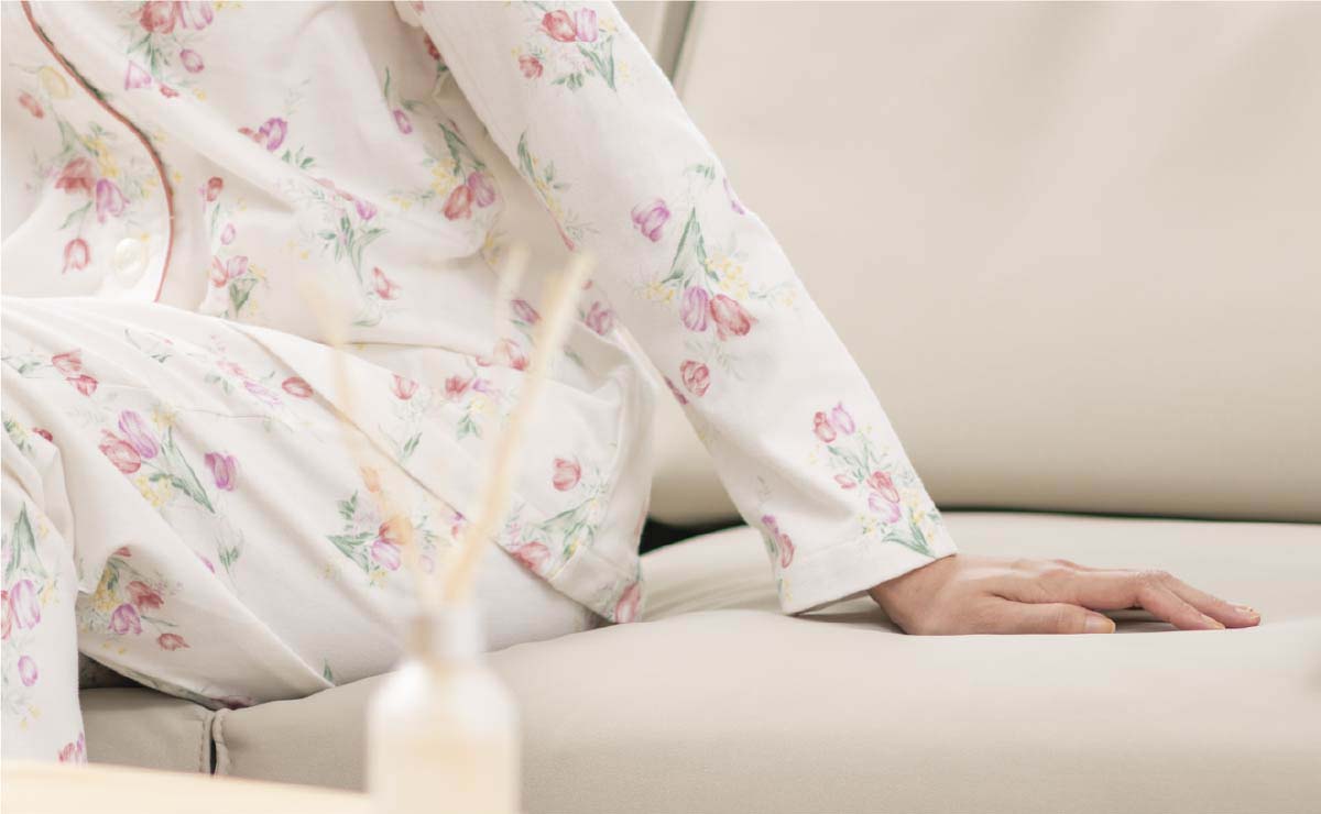 少し肌寒い時にサラッと着て頂けるニットパジャマです。お部屋着感覚で着て頂けるので、リビングで過ごすのも快適。