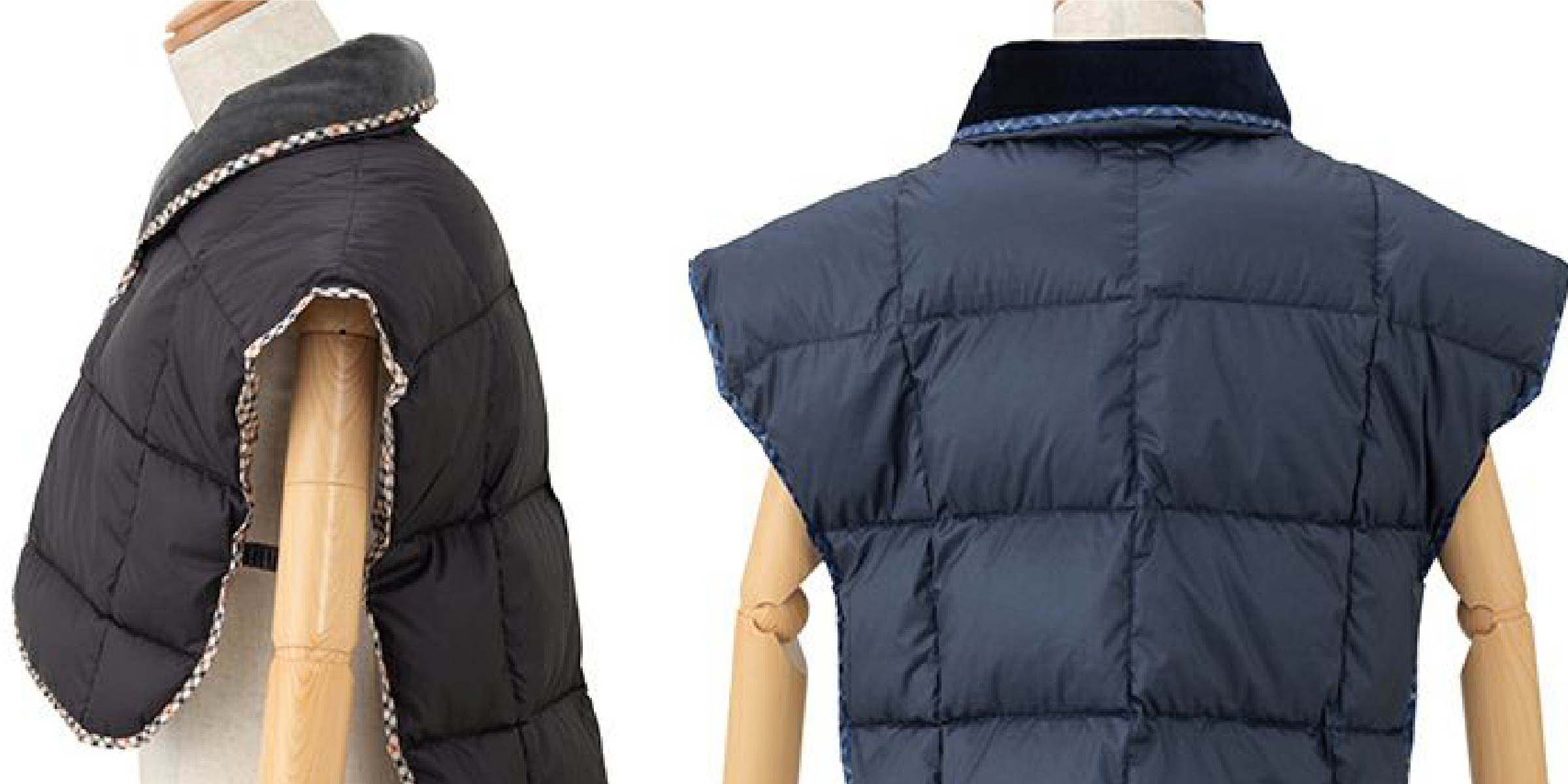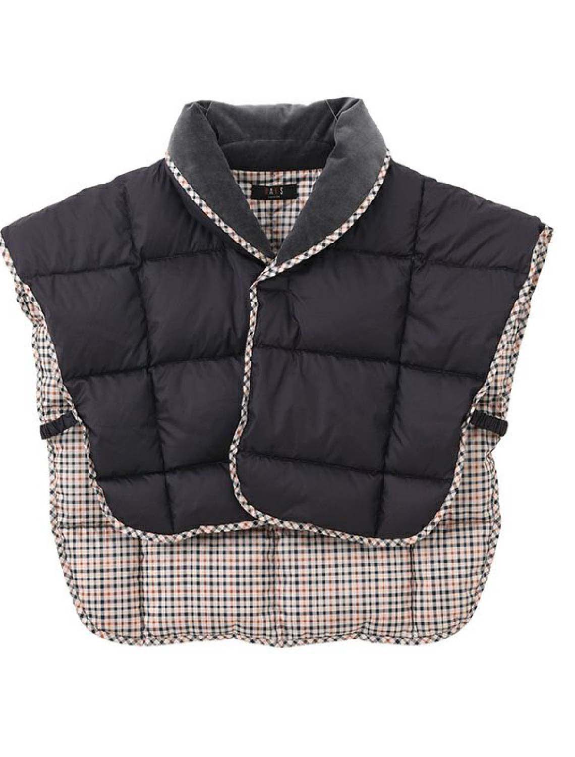 ダックスのチェック柄がおしゃれなアクセントになっている肩当てです。詰め物にはダウンとフェザーを使用しましたのでふわっと軽く、着用した時の保温力が抜群です。室内での寒さ対策や体温調節に便利なアイテムです。