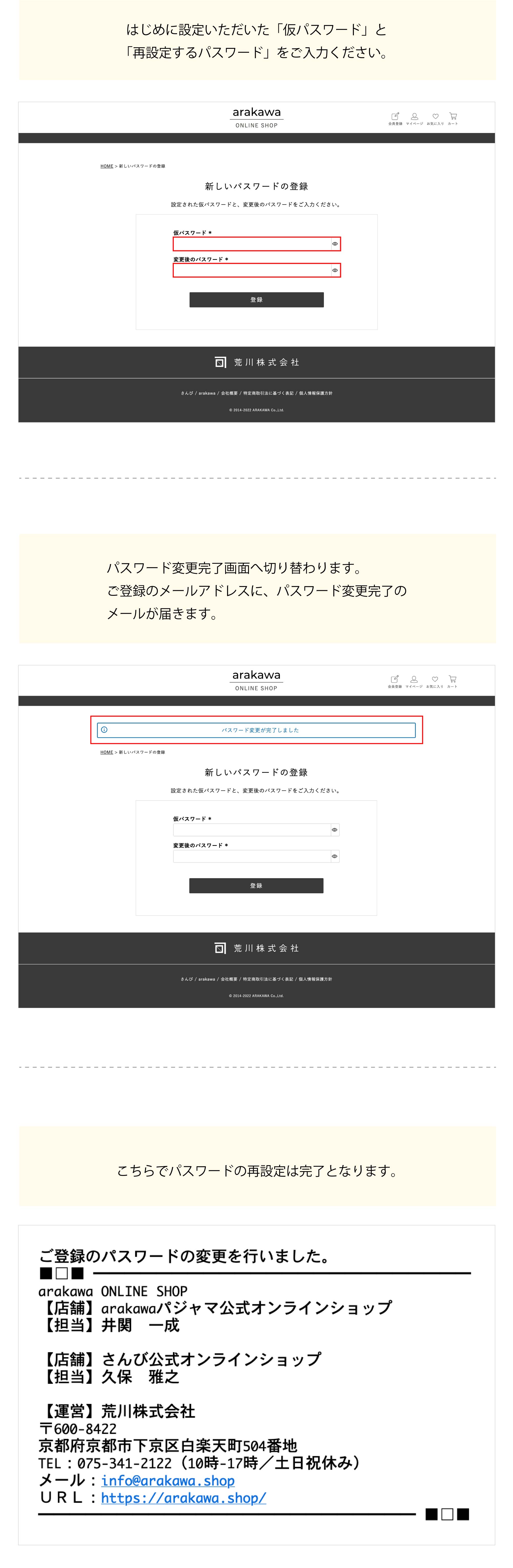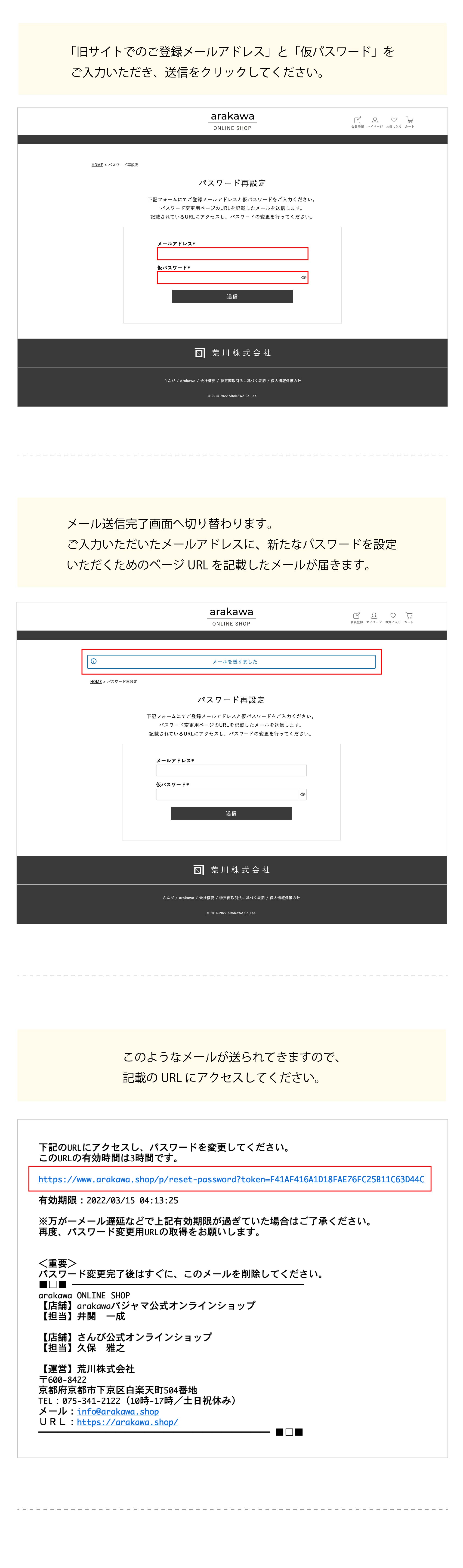 旧サイトの会員様の情報は新サイトに移行させていただいておりますが、 パスワードを再設定していただく必要がございます。 パスワード再設定ページのURLにアクセスいただき、下記の手順に従ってパスワードの再設定を進めていただきますようお願い申し上げます。 皆様にはお手数をおかけいたしますが、何卒よろしくお願い申し上げます。